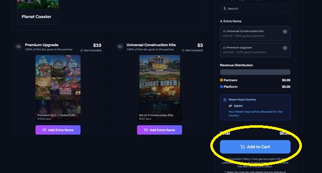 アカウントを作成後、こちらの「Add to Cart」からゲームを入手。4. Extra Items(DLCセット)は有料です。