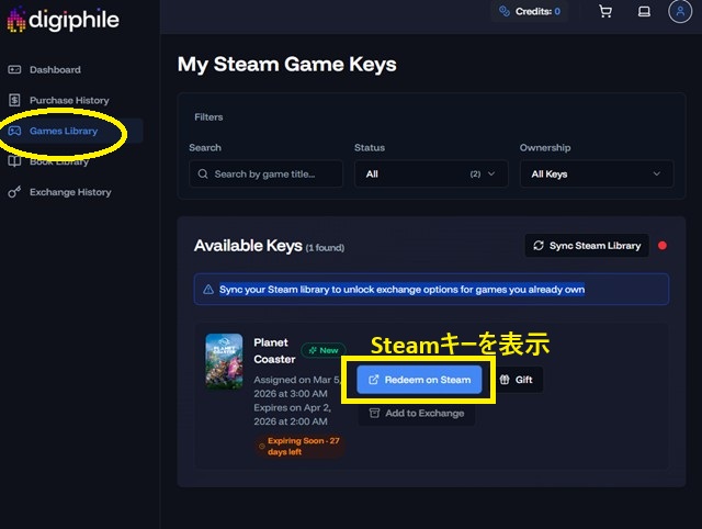 キーの有効化は右上アイコン内DashboardのGames Libraryから。