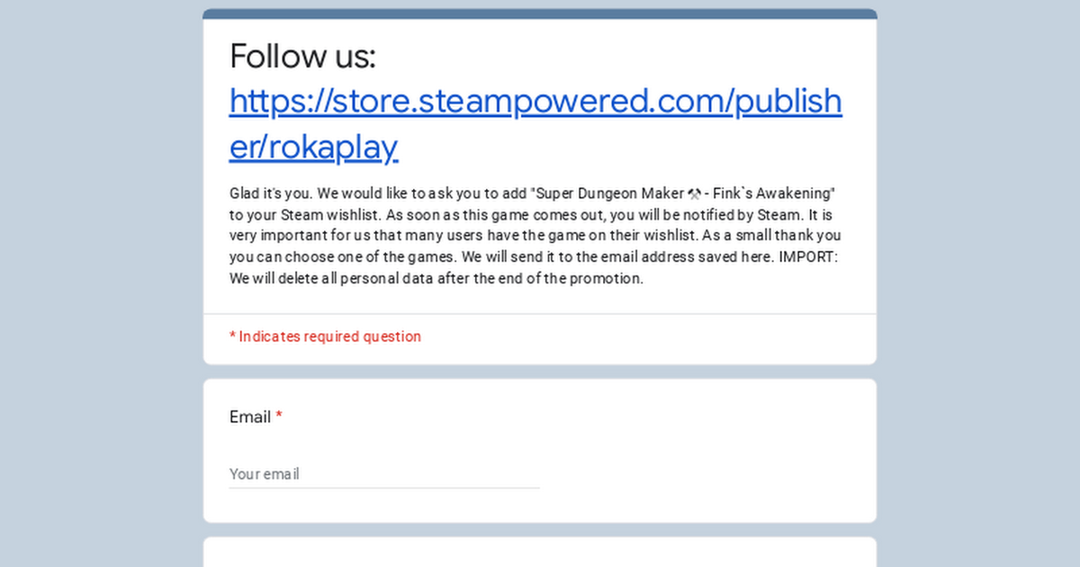 Glad it's you. We would like to ask you to add "Super Dungeon Maker ⚒ - Fink`s Awakening" to your Steam wishlist. As soo...