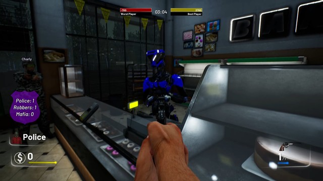 4~6人で遊べる一人称視点オンライン対戦ゲームです。プレイヤーには勝利条件や稼ぎ方が違う役職がそれぞれ与えられ、できるだけ多くのお金を稼いだ人が勝利となります。ボイスチャット必須。