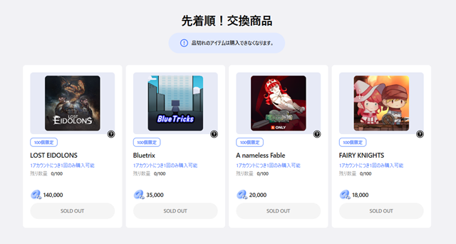 数量限定で先着順のため人気タイトルはあっという間にSOLD OUTになってしまいますが、毎週月曜日に新たなタイトルが追加されるので、フレークが溜まったらこまめにチェックすることをオススメします。