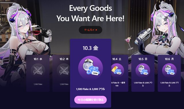 デイリーチェックイン以外でも、こちらのページにアクセスすることで毎日100フレークが貰えるほか、ガチャを回すことで運がよければ増やすことができます。(ヒキもありますが、基本的にやればやるほど増えるようになっていると思うので、毎日30回ぶん回しをオススメします。)